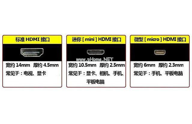 HDMI微型接口,又称为HDMI D型几口,这种接口宽度为6mm,一般主要用在智能手机、平板电脑等设备。