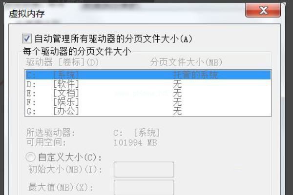8、然后取消”自动管理所有驱动的分页文件大小”前面的勾,再在下方的“自定义大小”中对数值进行修改就可以了。