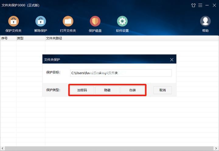 为了防止文件夹数据丢失,我们可以使用专业的文件夹保护软件来保护文件夹数据安全。在文件夹保护软件中最推荐的就是文件夹保护3000,它支持三种文件夹保护方式,分别是加密码、隐藏和伪装。