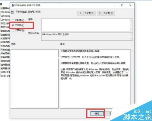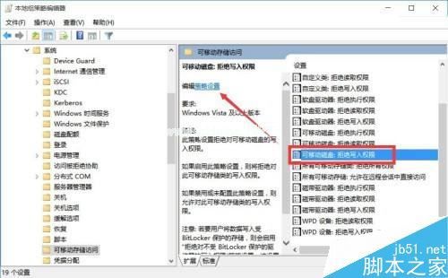 随后在打开的”可移动存储设备“管理界面后,找到右侧的”可移动磁盘:拒绝写入操作“选项并选中,点击”策略设置“按钮。