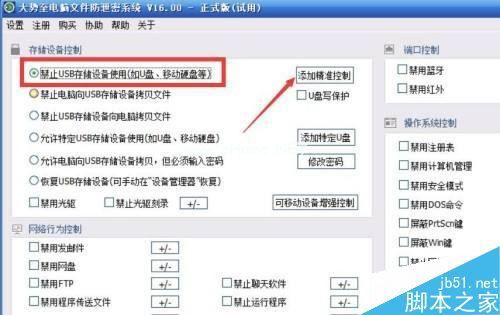 方法二:我们也可以借助相关电脑文件保护工具来实现。如图所示,在打开的程序主界面中,从”存储设备控制“栏目中,勾选”禁止USB存储设备的使用“选项,这样就实现了对U盘等可移动存储设备的限制访问功能。