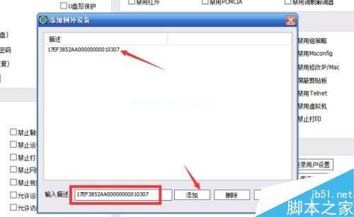 同时,我们还可以以更加精准的方式,实现对特定U盘的控制功能。在弹出的如图所示的”添加例外设备“界面中,通过输入允许访问电脑文件的U盘设备描述信息或识别码,点击”添加“按钮,就可以完成例外设备的添加操作。