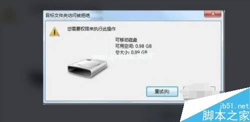 经过以上设置之后,当我们尝试插入U盘,并向U盘写入文件时,会弹出如图所示的操作窗口,在此就禁止了向U盘写入文件的操作,从而保护电脑文件的安全。