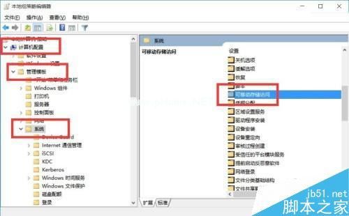 当打开如图所示的“组策略编辑”界面后,按图示进行展开,双击“系统”选项卡界面中的”可移动磁盘设备“项进入。