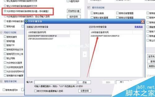 当然,我们也可以设置只允许特定U盘对电脑文件的访问及拷贝操作,只需要在”存储设备管理“栏目中,勾选”允许特定USB设备使用“选项,并添加对特定USB存储设备的支持即可。如图所示:
