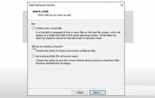 6、选择使用现有虚拟磁盘选项,然后单击下一步。