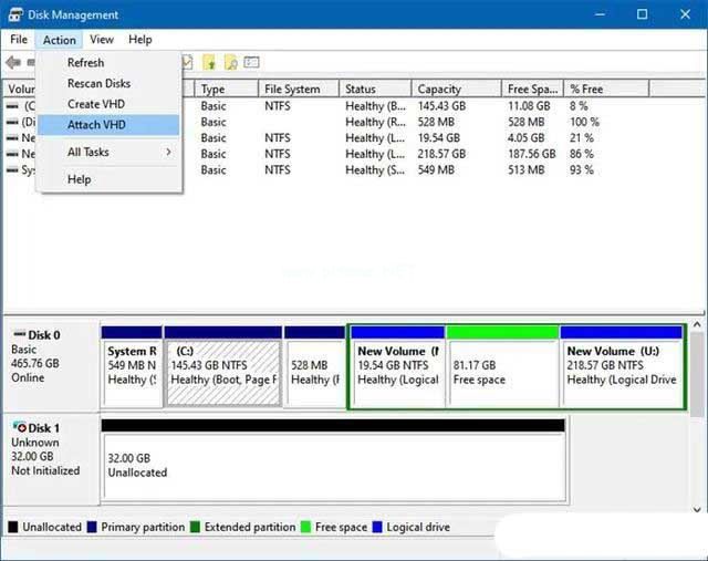 2、单击操作>附加VHD。