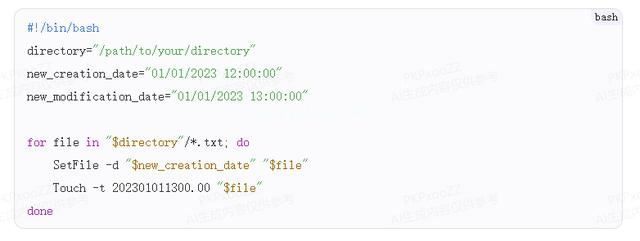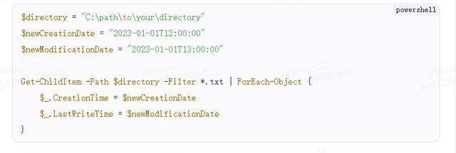 如果你需要批量修改多个文件的时间属性,可以使用一个脚本。例如,以下脚本会修改当前目录下所有.txt文件的创建和修改日期: