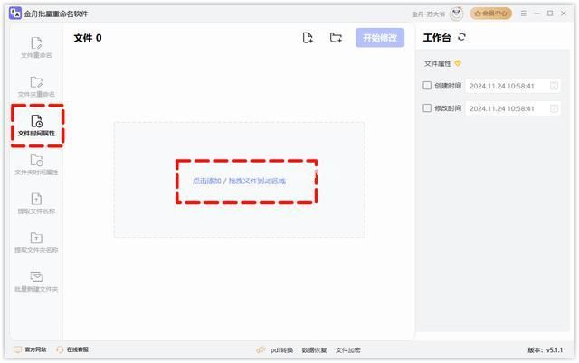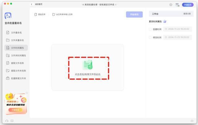 步骤1:搜索软件的官方网站,下载安装正版金舟批量重命名软件,运行进入主页面,选择“文件时间属性”功能,通过按钮或者直接拖拽方式进行文件的批量添加。