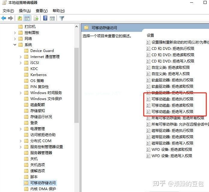 在组策略编辑器中,依次打开“计算机配置”-“管理模板”-“系统”-“可移动存储访问”,然后在右侧找到可移动磁盘的选择,有拒绝写入,拒绝所有权限,启用后即可禁用存储类型的USB设备接入。
