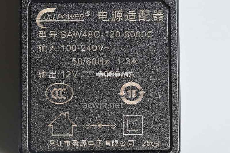 电源输出规格是12V/3A,实测空口待机功率为7.8W,接一个2.5G WAN口后的功率为8.3W,把所有2.5G网口插满时的功率为11.6W。