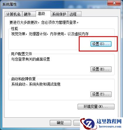 弹出“系统属性”对话框,选择“高级”选项卡,单击“性能”选项区域中的“设置”按钮,如下图所示。