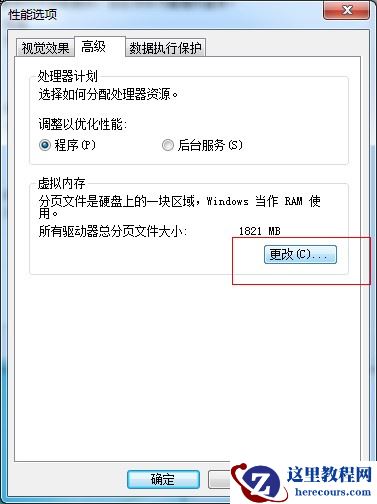 弹出“性能选项”对话框,选择“高级”选项卡,在其中单击“更改”按钮,如下图所示。