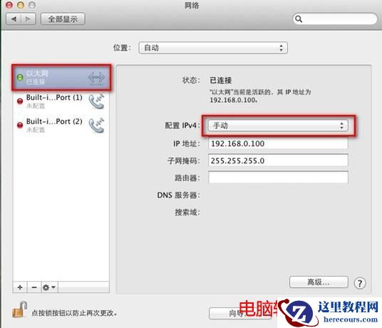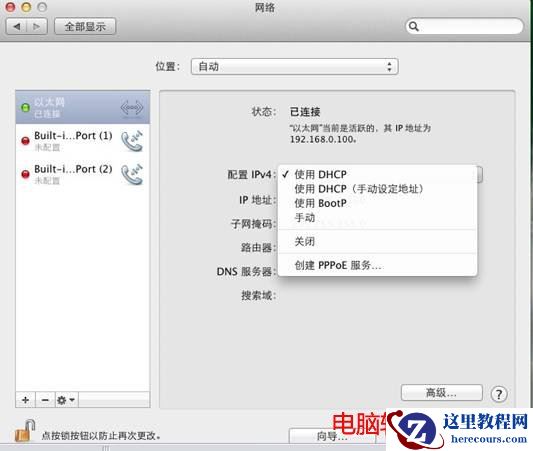 第四步 将打印服务器按照预订的使用拓扑与打印机和路由器连接好,将您的MAC电脑的IP地址改回之前的数值,例如配置IPv4改为使用DHCP或者手动指定为原来的IP地址。