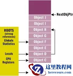 每个应用程序都有一组根对象,根是一些存储位置,他们可能指向托管堆上的某个地址,也可能是null。例如,所有的全局和静态对象指针是应用程序的根对象,另外在线程栈上的局部变量/参数也是应用程序的根对象,还有CPU寄存器中的指向托管堆的对象也是根对象。存活的根对象列表由JIT(just-in-time)编译器和clr维护,垃圾回收器可以访问这些根对象的。