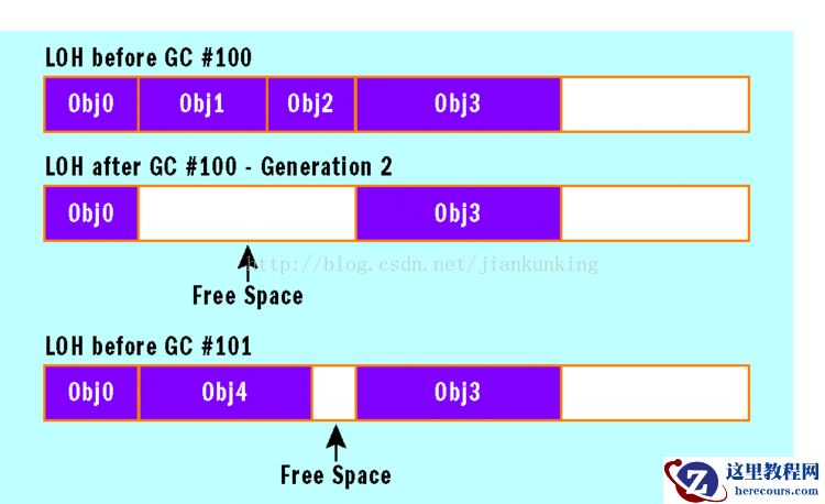 可以看到在未执行垃圾回收之前,一共有四个对象obj0-3;第一次二代垃圾回收之后obj1和obj2被回收掉了,回收掉之后obj1和obj2所占空间被合并到了一起,在obj4申请分配内存时就把obj1和obj2回收后释放的空间分配给它了;同时留下了一块内存碎片。如果这个碎片的大小小于85000byte,那么这个碎片就在这个程序的生命周期中永远不能被再次利用了。