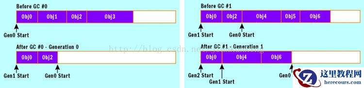 上图中第一次垃圾回收之前有四个对象obj0-3;在第一垃圾回收之后obj1和obj3被回收了,同时obj2和obj0移动到一起了;在第二次垃圾回收之前有分配了三个对象obj4-6;在第二次执行垃圾回收之后obj2和obj5被回收了,obj4和obj6被移动到obj0旁边。