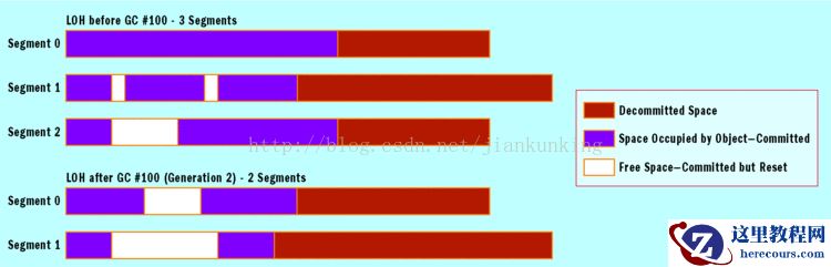 在2代垃圾回收时,可以将不需要的内存通过VirtualFree交还给操作系统。交还的过程参见下图:
