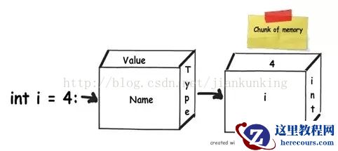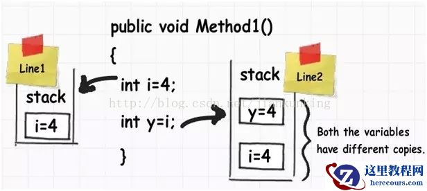 通过下图,我们可以看到一个名为i的整形数据类型,它的值被赋值到另一个名为j的整形数据类型。他们的值都被存储到了栈上。
