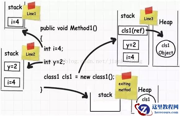 •离开这个Method1方法时(the fun):现在执行控制语句开始离开方法体,这时所有在栈上为变量所分配的内存空间都会被清除。换句话说,在上面的示例中所有与int类型相关的变量将会按照“LIFO”后进先出的方式从栈中一个一个地出栈。