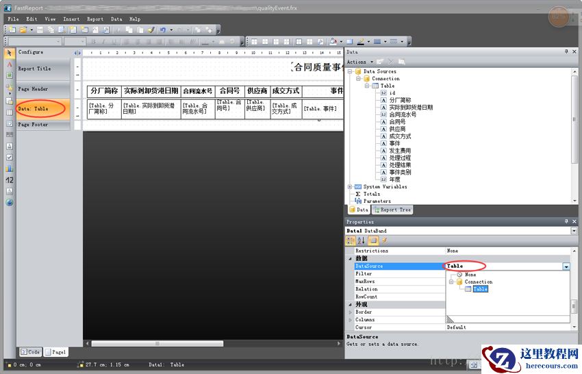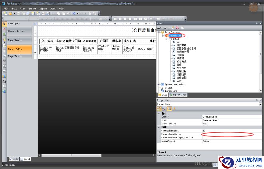 打开报表设计器,找到数据连接项,把属性中的ConncetionString中存储的连接信息删除。当然直接这样删除,报表就找不到数据了,因此我们还要在程序中把数据库连接信息发给报表。