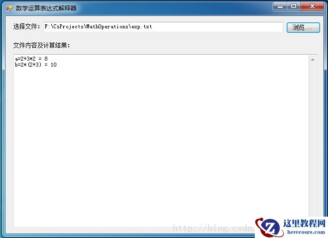 <p style="margin-bottom: 7px;"> private void button_browse_Click(<a href="http://www.php.cn/wiki/60.html" target="_blank">object</a> s<a href="http://www.php.cn/wiki/1048.html" target="_blank">end</a>er, EventArgs e)<br/> {<br/> Open<a href="http://www.php.cn/wiki/1313.html" target="_blank">File</a>Dialog fbd = <a href="http://www.php.cn/wiki/165.html" target="_blank">new</a> OpenFileDialog();<br/> fbd.Title = "请选择一个文件:";<br/> fbd.CheckFileExists = true;<br/> fbd.CheckPathExists = true;<br/> fbd.Filter = "*.txt(文本文件)|*.txt|*.*(所有文件)|*.*";<br/> fbd.FileName = Environment.GetFolderPath(Environment.SpecialFolder.MyComputer);<br/> <a href="http://www.php.cn/wiki/109.html" target="_blank">if</a> (fbd.ShowDialog() == System.Windows.<a href="http://www.php.cn/wiki/125.html" target="_blank">For</a>ms.DialogResult.OK)<br/> {<br/> textBox_save<a href="http://www.php.cn/wiki/1275.html" target="_blank">Dir</a>.Text = fbd.FileName;<br/> try<br/> {<br/> FileStream fs = new FileStream(fbd.FileName, FileMode.Open, FileAccess.Read);<br/> StreamReader sr = new StreamReader(fs);<br/> <a href="http://www.php.cn/wiki/121.html" target="_blank">while</a> (!sr.EndOfStream)<br/> {<br/> <a href="http://www.php.cn/wiki/57.html" target="_blank">string</a> line = sr.<a href="http://www.php.cn/wiki/691.html" target="_blank">ReadLine</a>();<br/> analyse(line);<br/> }<br/> }<br/> catch (<a href="http://www.php.cn/wiki/265.html" target="_blank">Exception</a> ex)<br/> {<br/> MessageBox.Show("错误:" + ex.Message + "\r\n堆栈:" + ex.StackTrace);<br/> }<br/> }<br/> }<br/></p>分析一行表达式: