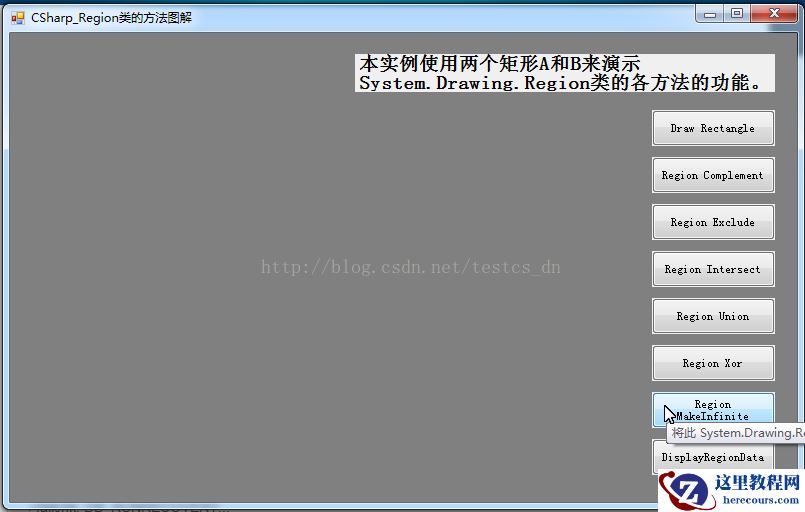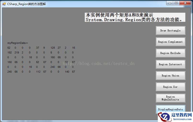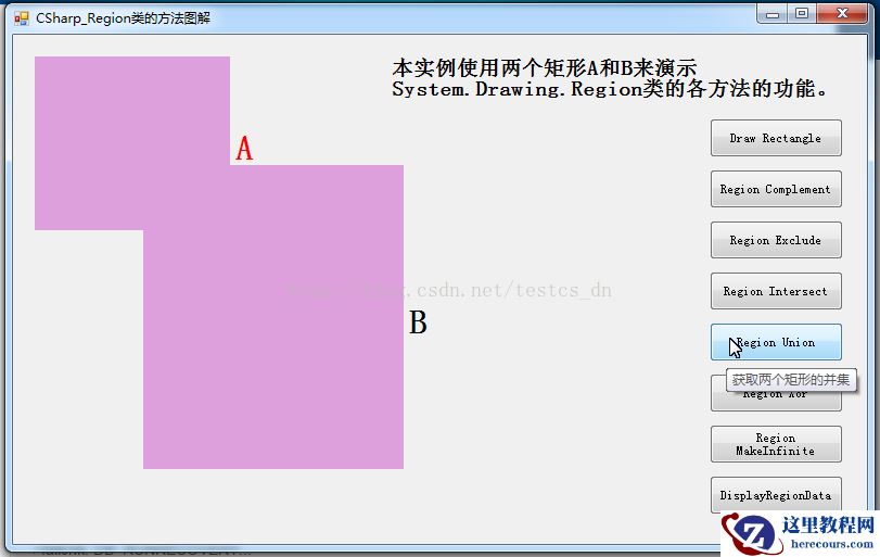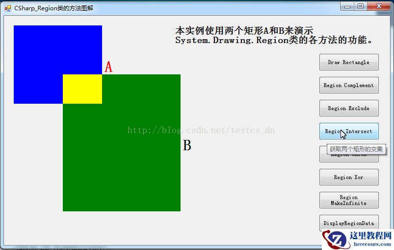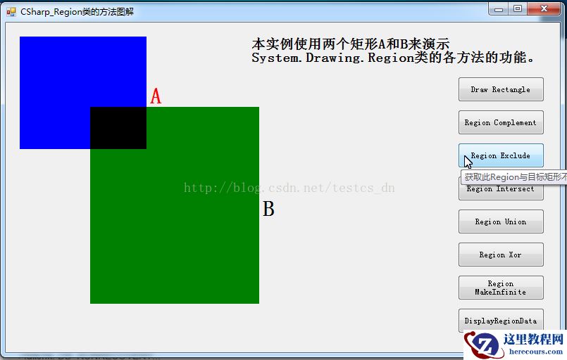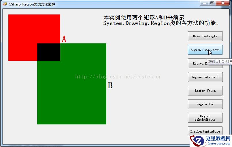 本实例使用两个矩形a和b来演示system.drawing.region类的各方法的功能。