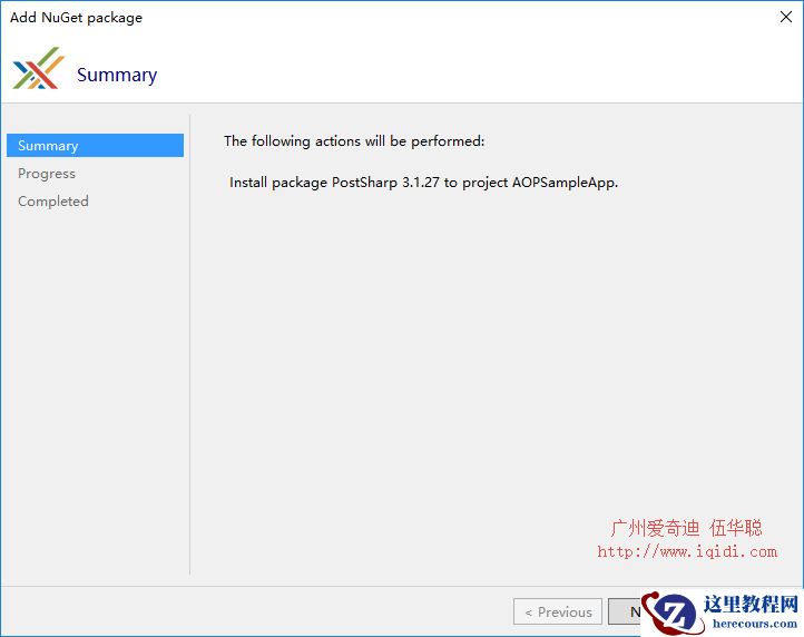 添加后,会弹出PostSharp的插件提示对话框,提示将加入相应的PostSharp包等内容,如下所示。
