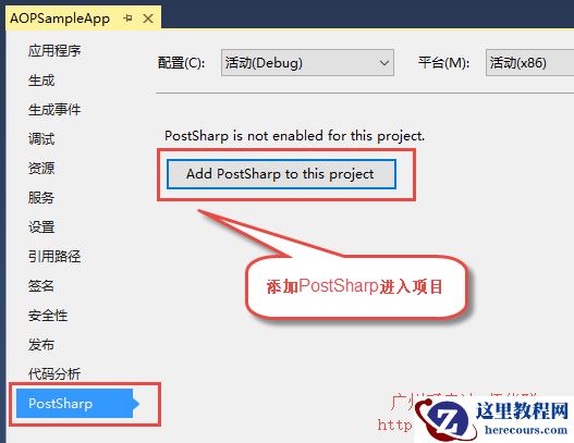 一般项目如果需要使用PostSharp特性的,在项目属性的【PostSharp】选项页中,使用【Add PostSharp to this project】把PostSharp加入到项目里面进行使用。
