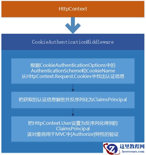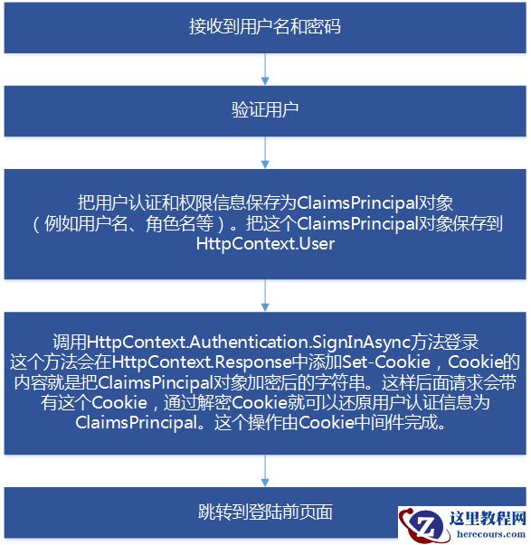 .NET Core中通过CookieAuthenticationMiddleware这个中间件识别HttpContext中认证相关的Cookie,从而添加用户的验证和授权信息。最关键的是ClaimsPrincipal对象,它记录用户的认证和授权信息(除此之外当然也可以包含其它你需求的任意信息),从上面登录过程可以看到,登录成功后用户认证和授权信息保存至ClaimsPrincipal对象(实际上对于这条Cookie键值对中的认证信息保存为ClaimsIdentity,一个ClaimsPrincipal可以包含多个ClaimsIdentity),然后在HttpContext.Response的Headers中添加Set-Cookie,Key为Cookie中间件中指定的CookieName,Value就是这个对象加密后的字符串。以后的HttpContext都会带有这个Cookie,Cookie中间件会把符合这个CookieName的Cookie取出来,解密并还原为ClaimsPrincipal对象,并把HttpContext.User设置为这个对象。后面MVC中间件在路由到相应Controller和Action的时候就可以根据Authorize特性中指定的认证和角色在HttpContext.User中进行检查,不满足检查则跳转至相应页面。因此需要注意的就是一定要把Cookie中间件放在MVC中间件之前。