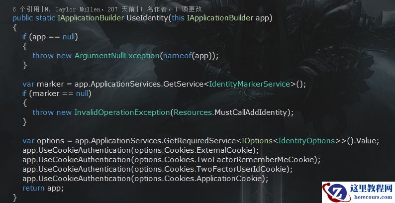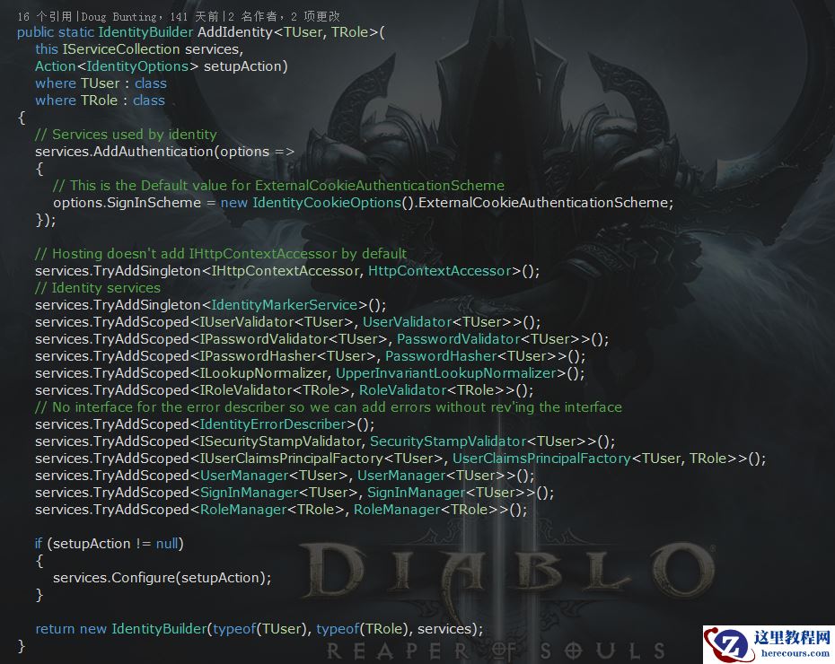 我们在开发认证相关功能时使用这三个核心类即可满足大多数需求。我们在使用这几个核心类的对象时都是通过依赖注入获取的,那么这些相关的依赖是什么时候注入的呢?在Startup的ConfigureServices方法中有AddIdentity扩展方法,就是在这个方法中添加了需要的所有依赖。