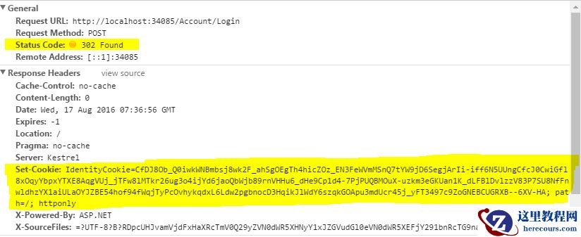 登录成功后Response的Header中包含了Set-Cookie,Cookie的Key需要和Cookie中间件中设置的要解密的Cookie的Key一致,在截图中这个Cookie的Key是IdentityCookie。设置Cookie的同时返回302重定向到登录页面。