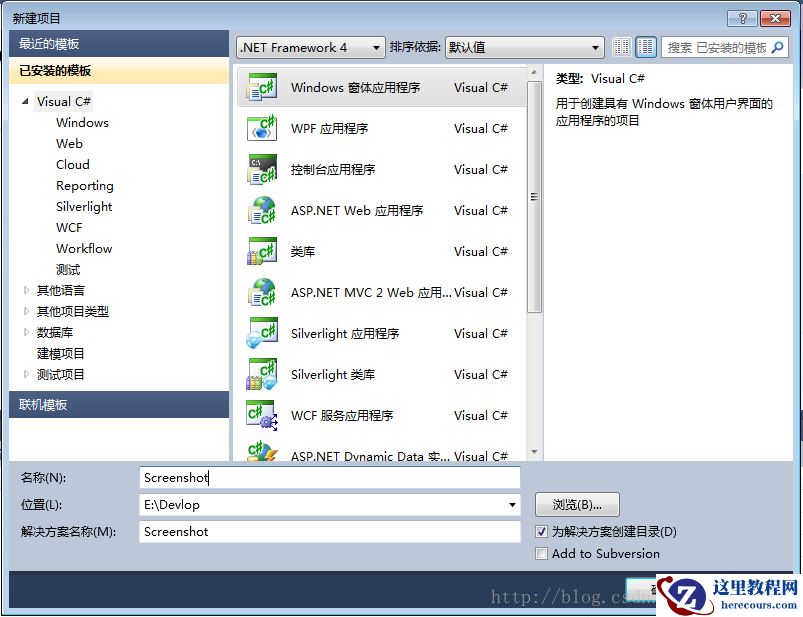 项目类型选择:Windows窗体应用程序