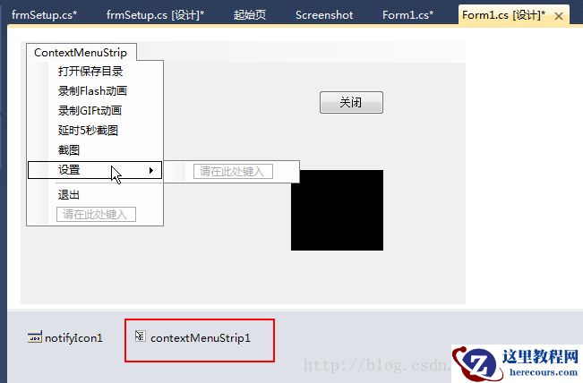 打开主窗体Form1的设计视图,选中“contextMenuStrip1”