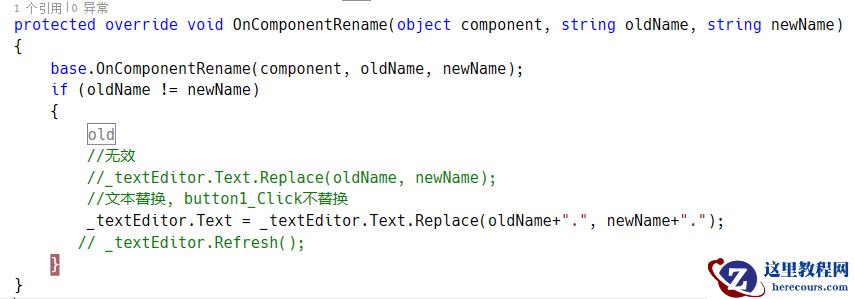 }CodeDomHostLoader类中有OnComponentRename,在设计器重命名组件时候响应,这里可以修复后台.cs中的控件引用