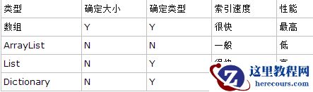 Dictionary:在初始化的时候也必须指定其类型,而且他还需要指定一个Key,并且这个Key是唯一的。正因为这样,Dictionary的索引速度非常快。但是也因为他增加了一个Key,Dictionary占用的内存空间比其他类型要大。他是通过Key来查找元素的,元素的顺序是不定的。