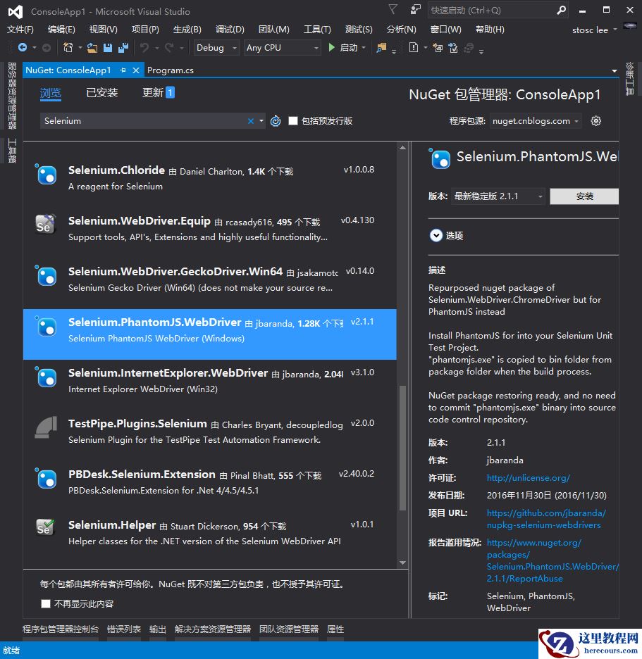 第四步:打开nuget安装Selenium.PhantomJS.WebDriver包。
