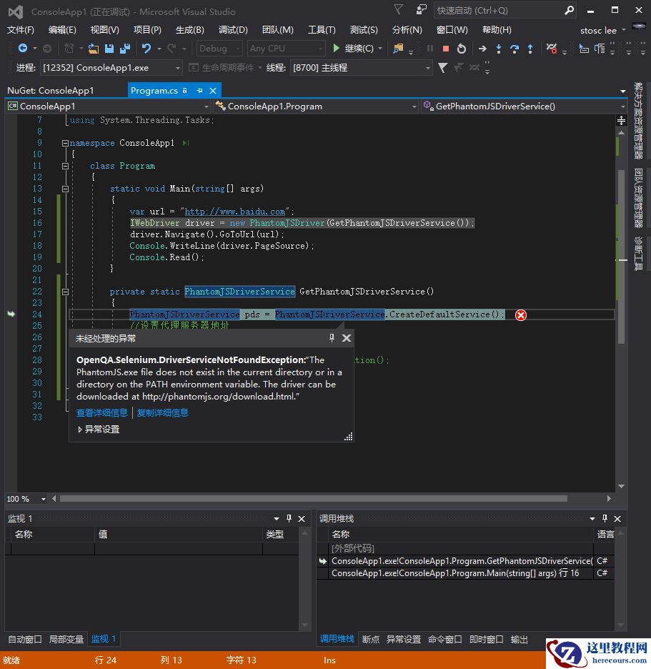 第三步:写下如下图所示的代码。但是执行的时候会报错。原因是找不到PhantomJS.exe。这时候可以去下载一个,也可以继续看第四步。