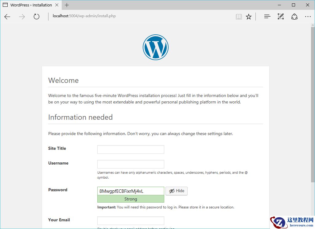 然后访问http://localhost:5004/ ,只要MySQL 配置正确,就会跳转至安装界面。注意要先在数据库中创建wordpress 数据库。