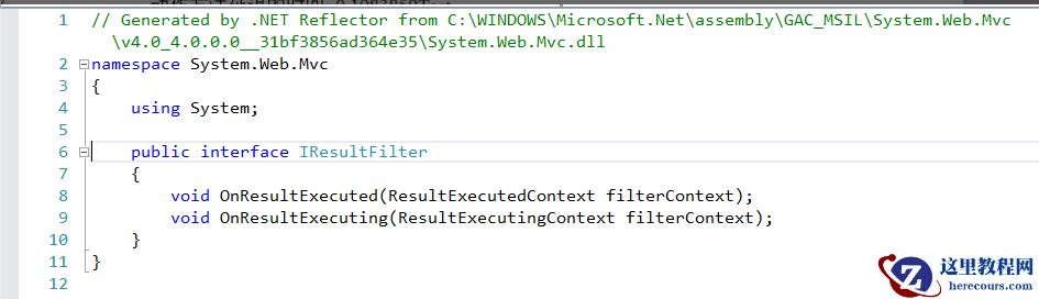 结果过滤器是多用途的过滤器,他会对动作方法所产生结果进行操作,结果过滤器实现IResultFilter接口,创建自定义结果过滤器需要现IResultFilter接口,该接口代码如下所示: