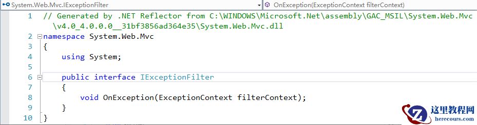 如果我们对异常过滤器有特殊的需求,可以通过自定义的异常过滤器来完成,创建自定义异常过滤器必须实现IExceptionFilter接口,该接口代码如下: