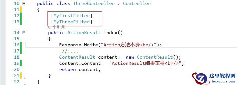 (1)、相同类型过滤器应用示例:两个自定义Action过滤器MyFirstFilter,MyThreeFilter应用到同一个Action方法Index上。