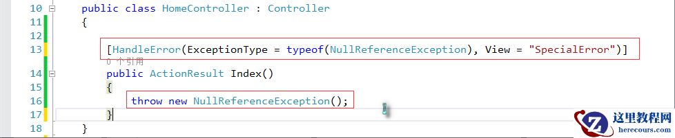 在控制器中应用MyExection异常过滤器,并主动让其抛出一个空引用异常,以便测试。