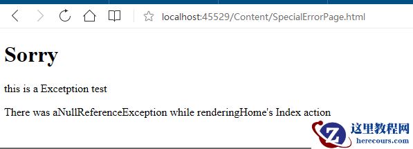 <!DOCTYPE html> <html xmlns="http://www.w3.org/1999/xhtml"> <head> <meta http-equiv="Content-Type" content="text/html; charset=utf-8"/> <title></title> </head> <body> <h1>Sorry</h1> <p>this is a Excetption test</p> There was aNullReferenceException while renderingHome's Index action </body> </html>