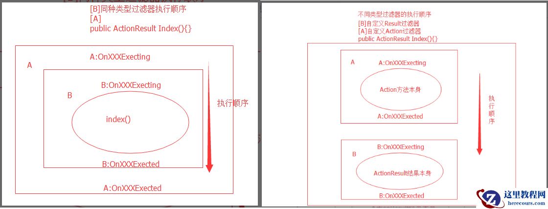 执行顺序:相同类型过滤器,执行顺序靠近方法的先执行,不同类型的过滤器一般执行顺序为【authorize--->action--->actionResult】至于异常过滤器不分先后,只要抛出异常时就会执行异常过滤器。如果要调整执行顺序,可以通过调整Order方法值大小来控制执行顺序,值越小,越先执行。下图是Action/Result过滤器应用的执行顺序图