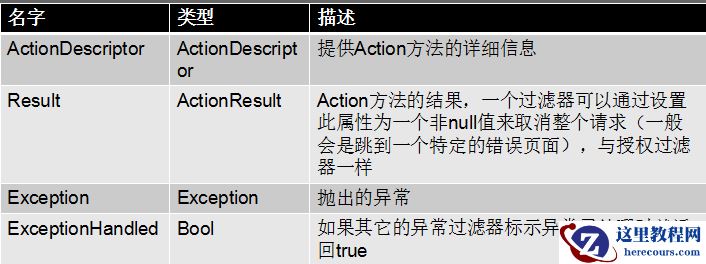 当一个未知处理异常发生时,OnException方法会被调用。该方法的传递一个ExceptionContext对象,派生于ControllerContext类,定义了一些额外的过滤器专有属性如下表所示: