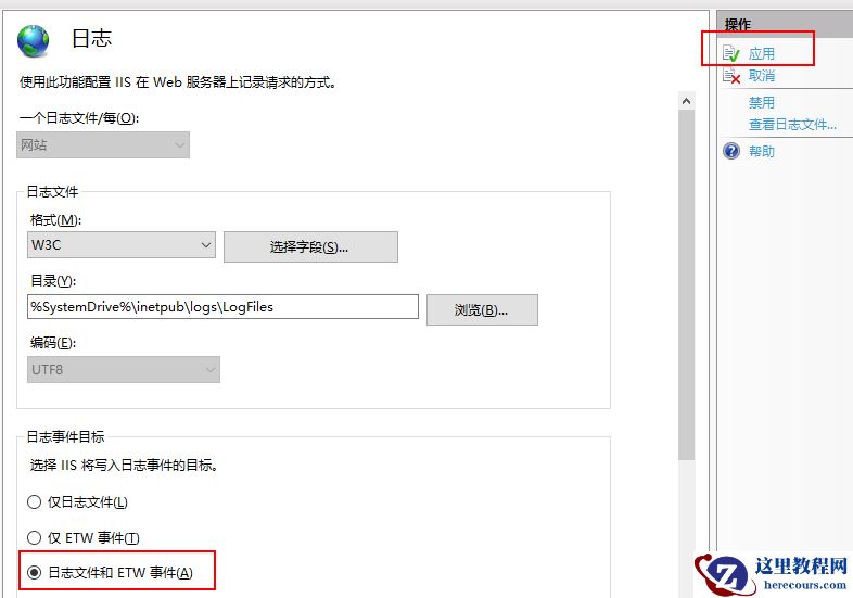 4、设置IIS的日志记录方式为日志文件和ETW事件