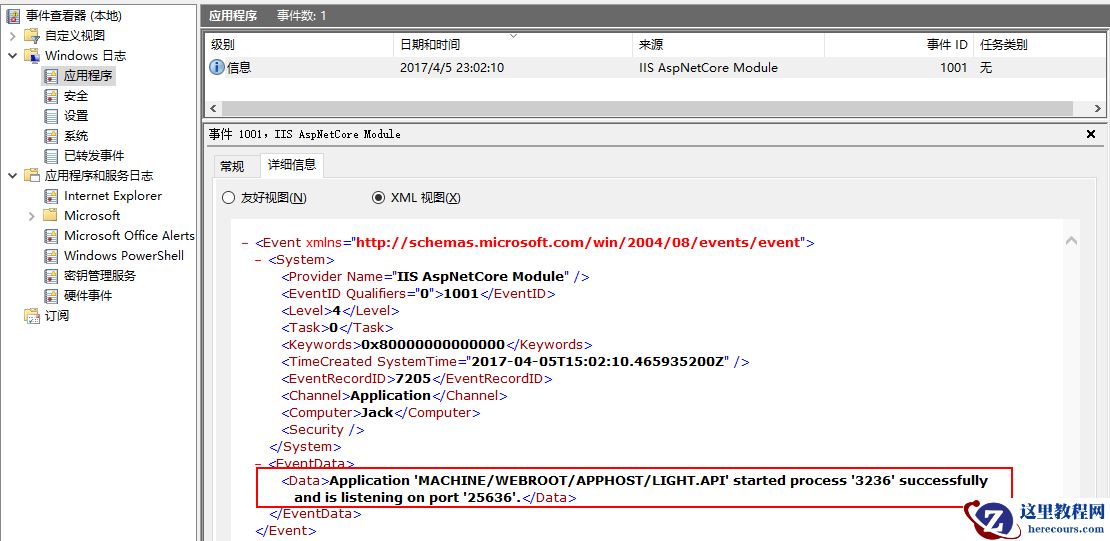 5、重新访问网站,然后打开Windows应用程序日志,你会看到这样一条信息。意思是说你的应用程序已经由PID为3236的进程启动,并且在25636的端口上监听着。