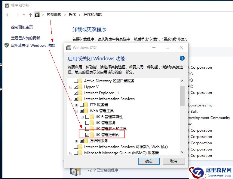 1、在控制面板→程序→启用或关闭Windows功能→勾选Internet Information Services以及Web管理工具下的IIS管理控制台