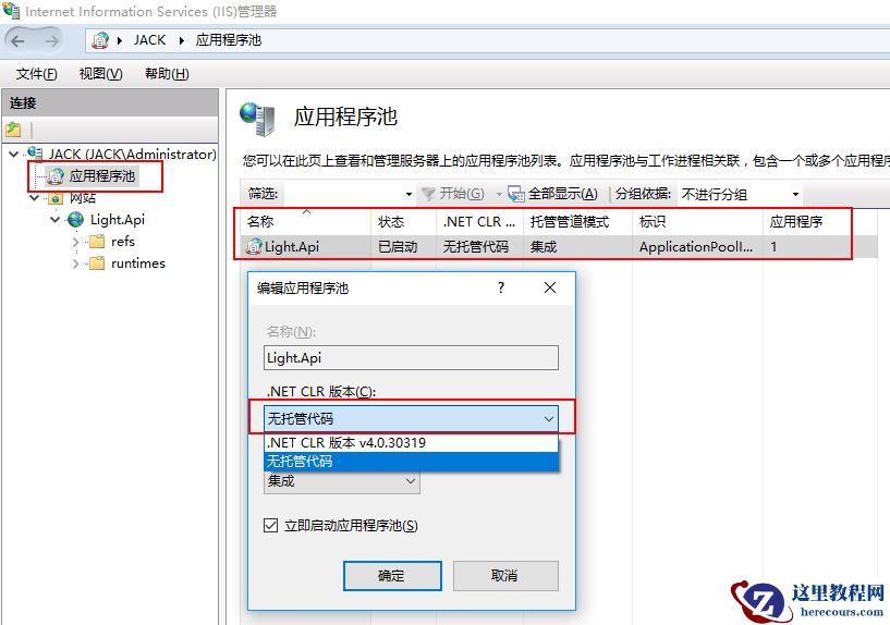 2、设置应用程序池的.NET CLR版本为“无托管代码”,因为刚才也说了,IIS是作为一个反向代理的角色,并不需要它来托管代码